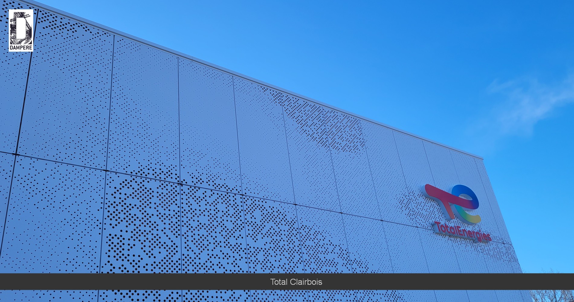 Les architectes de la façade de cette station essence Total au relais de Clairbois, voulaient un effet de tôle perforée décorative en forme de nuage sur base de perforations rondes sur toutes les façades en continuité du bâtiment de services et commerce.